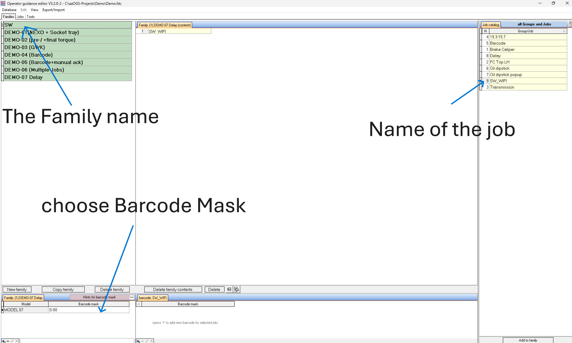 In the Family tab of the Editor, create a new family. Configure the Model and Barcode mask, then link the newly created job to the family.