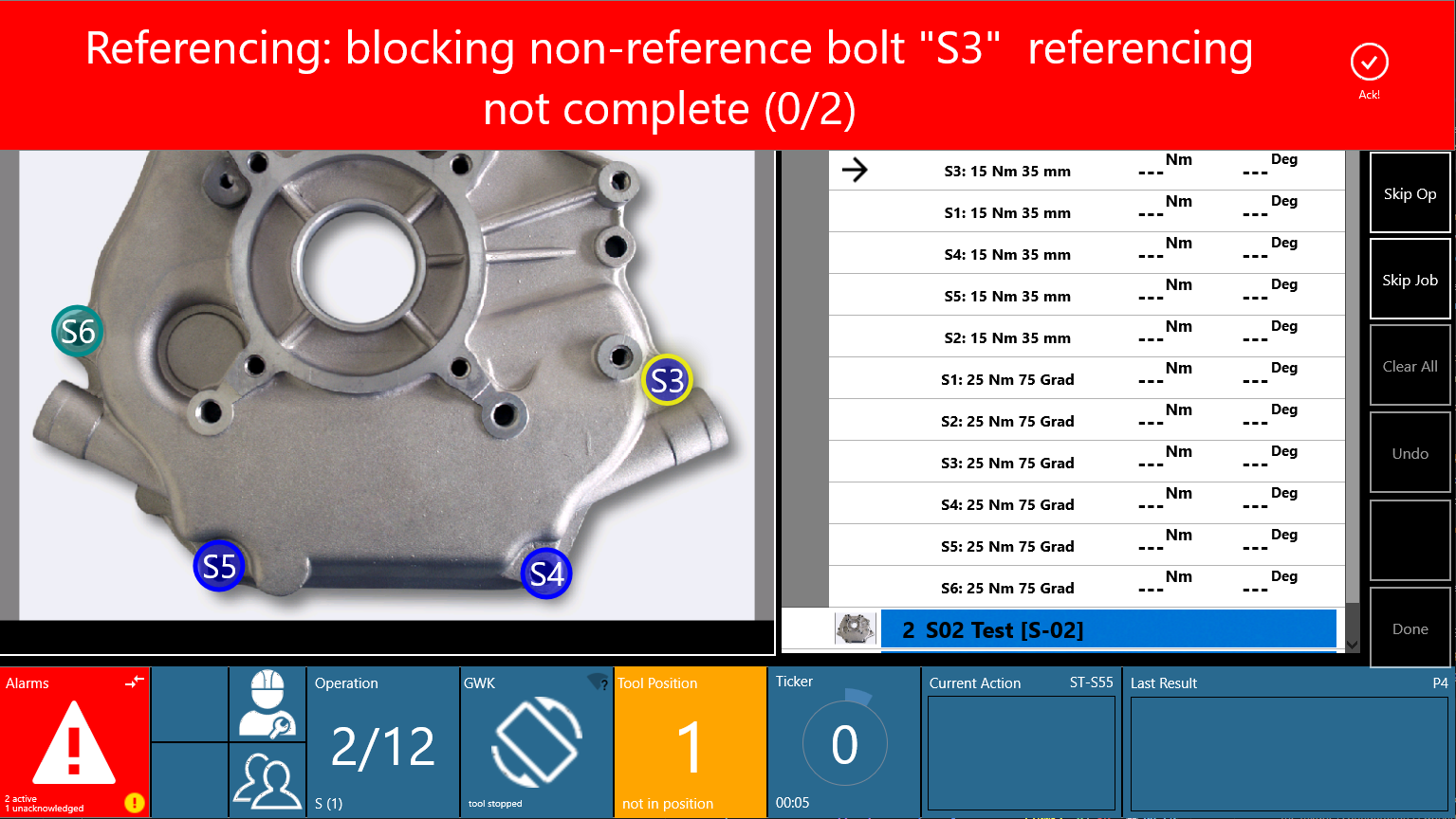- A blocking alarm banner is shown, e.g.: "Referencing: blocking non-reference bolt 'S3' referencing not complete (0/2)"
